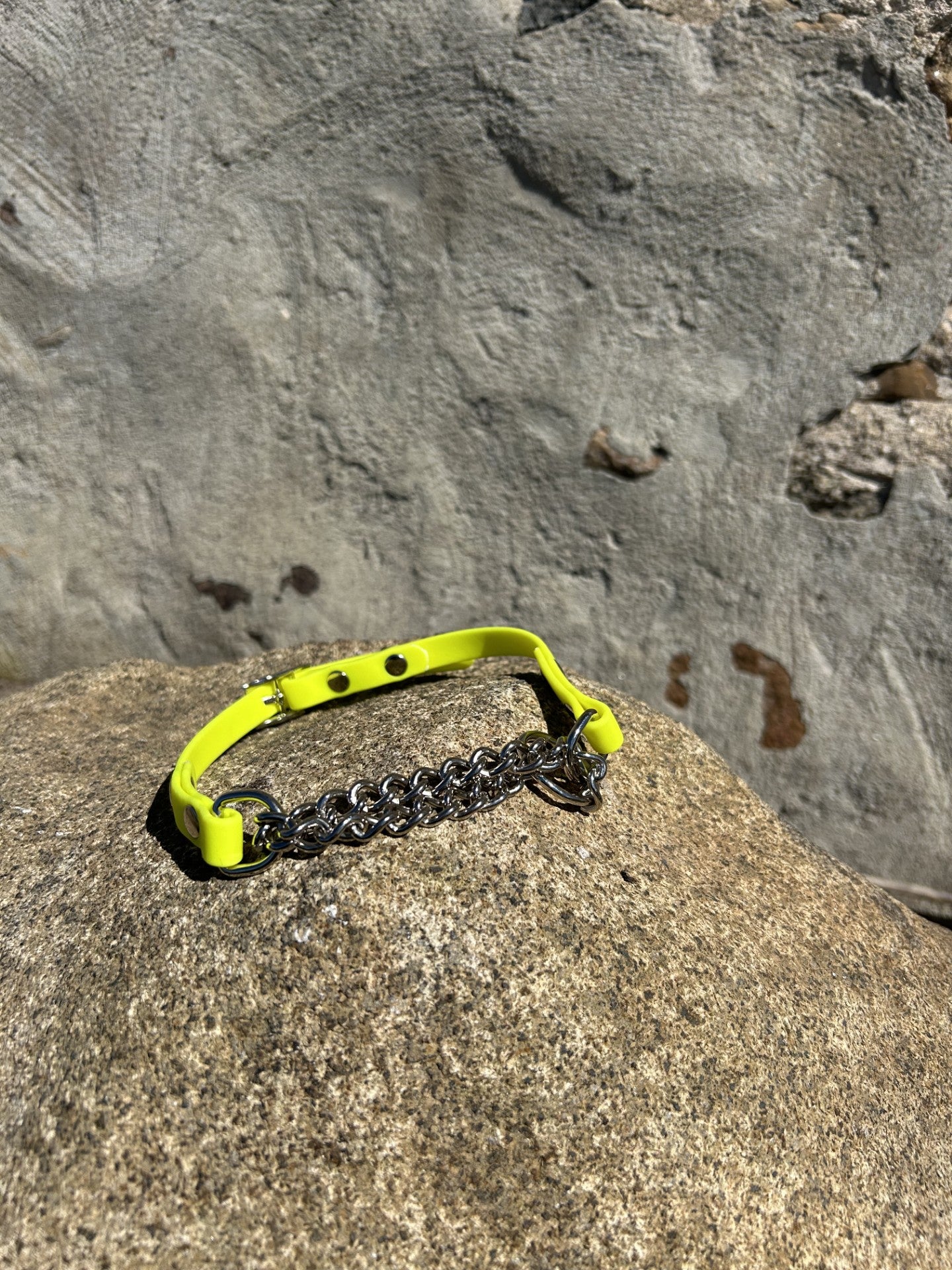 Biothane dog collars offer durability, versatility, and comfort. Unlike leather, they are waterproof, which makes them easy to clean after even the muddiest adventures. You can select the width (1/2 inch to 2 inches), hardware and colour of the collar to design your own custom creation.